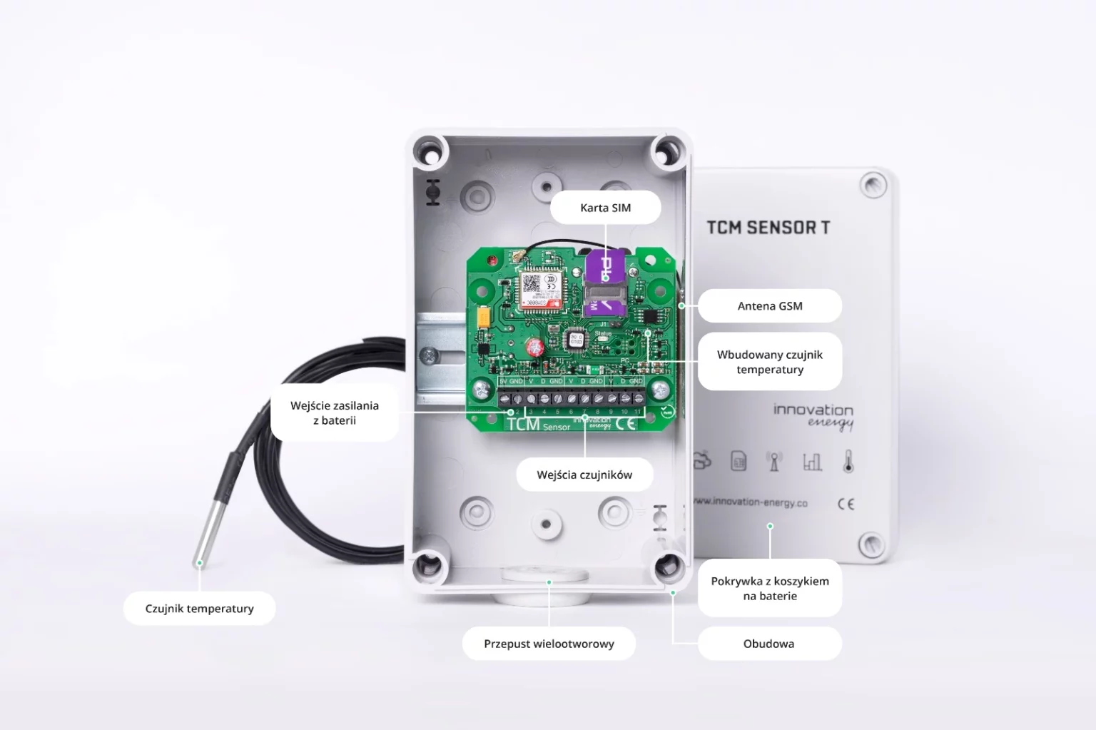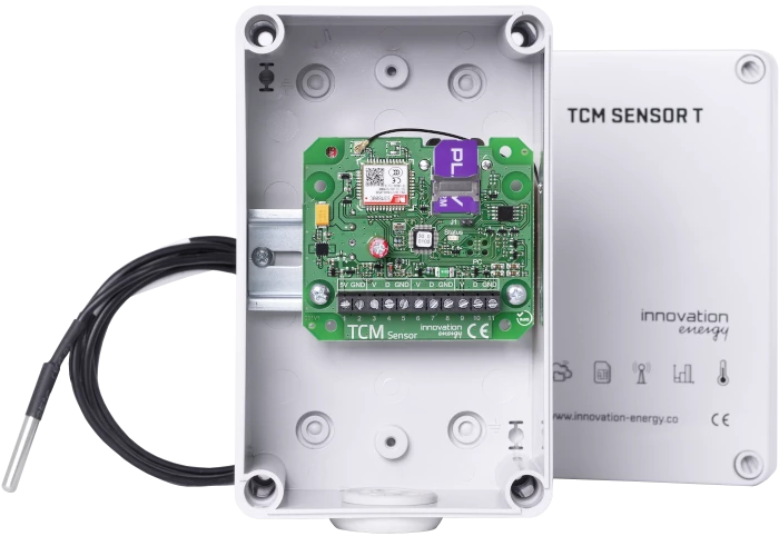 TCM Sensor T wyposażony w moduł GSM i kartę SIM automatycznie przesyła pomiary temperatury do panelu online.
